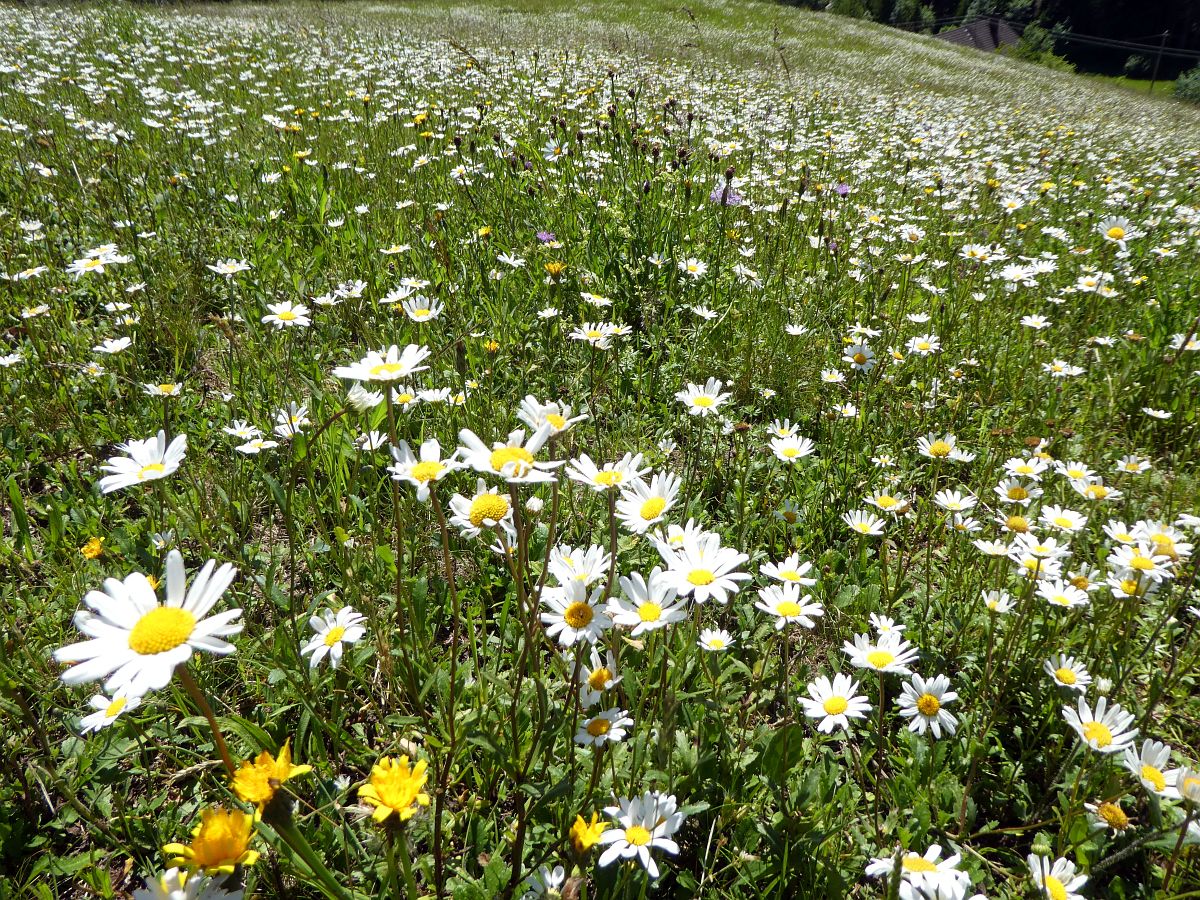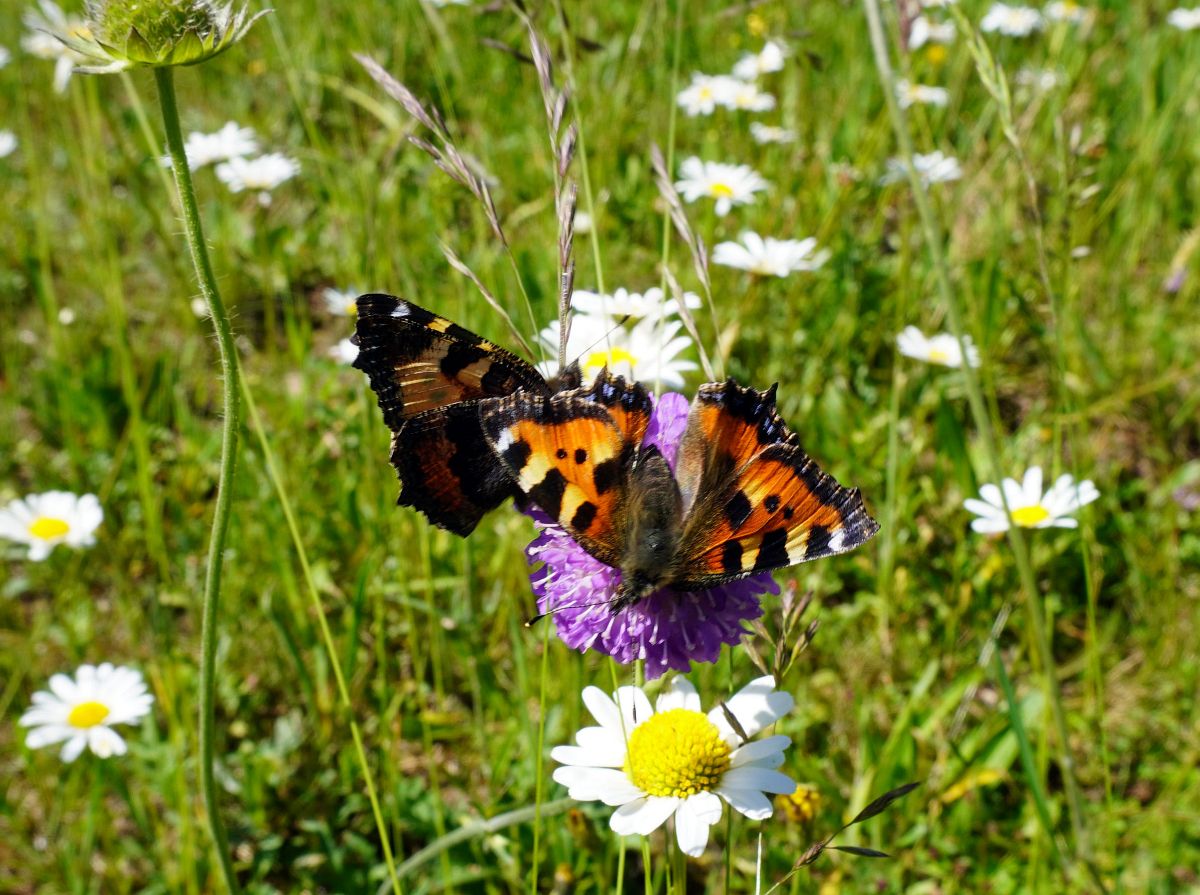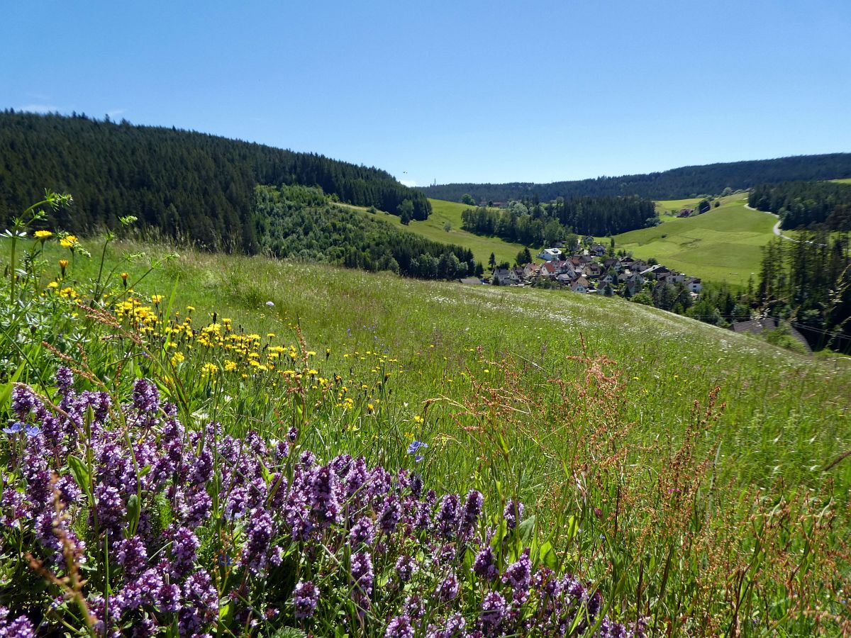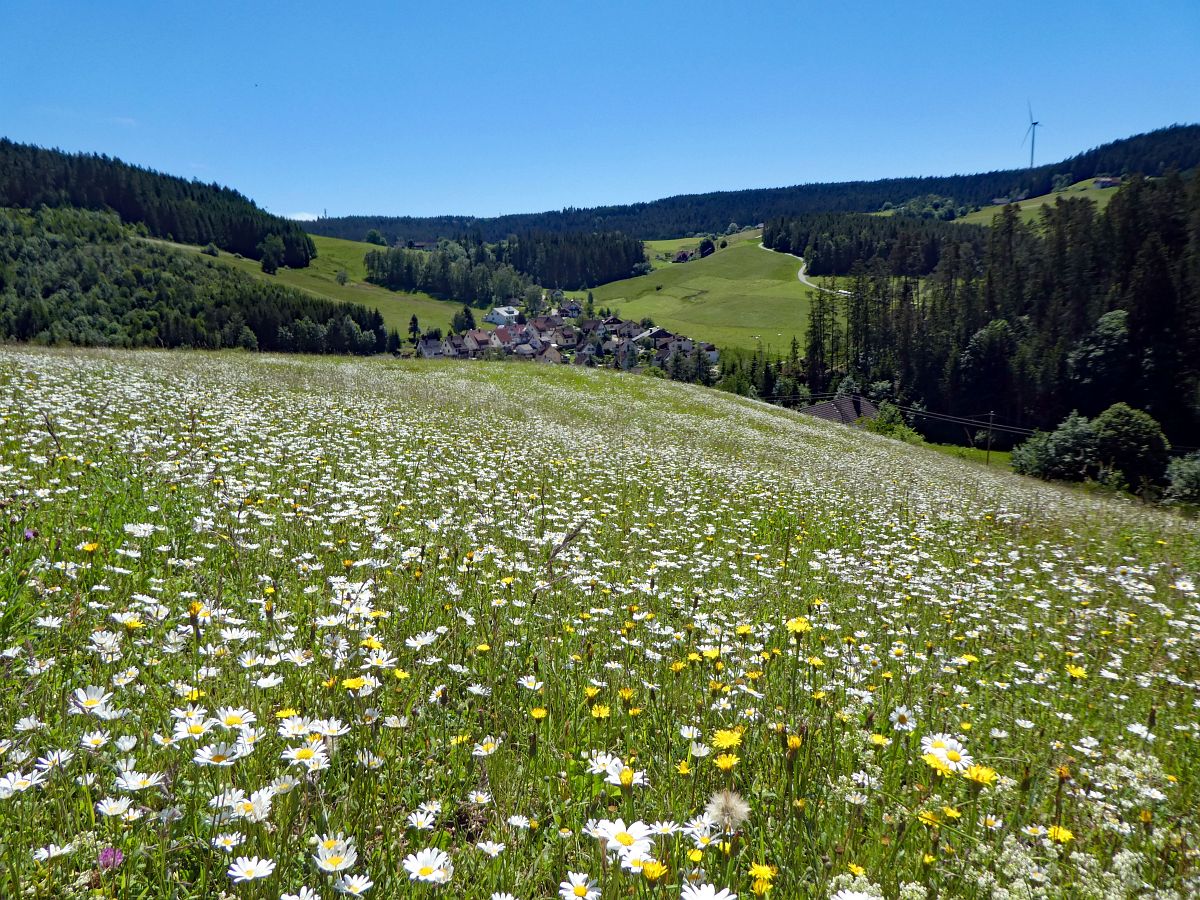 Dort wo die Bauern noch nicht gemäht haben, erblüht ein wahres Blumenmeer auf den Wiesen. Die Margeriten lassen die Hänge in Weiß und Gelb strahlen. Glockenblumen und Witwenblumen geben blaue Tupfen hinzu. Das Violett des Thymians lässt Feldränder warm leuchten und verströmt einen herb-würzigen Duft. In dieser Jahreszeit lenken die Blumen den aufmerksamen Wander ganz von der spektakulären Schwarzwaldlandschaft ab mit ihren Aussichten auf Berge und Täler.