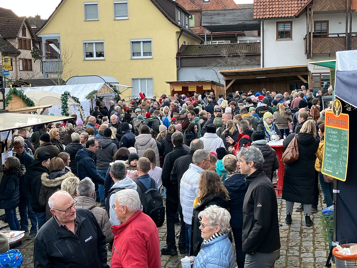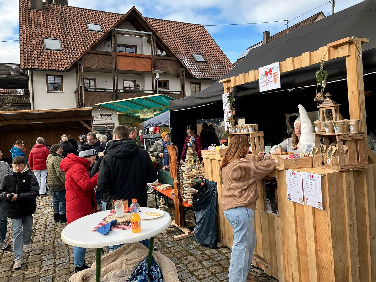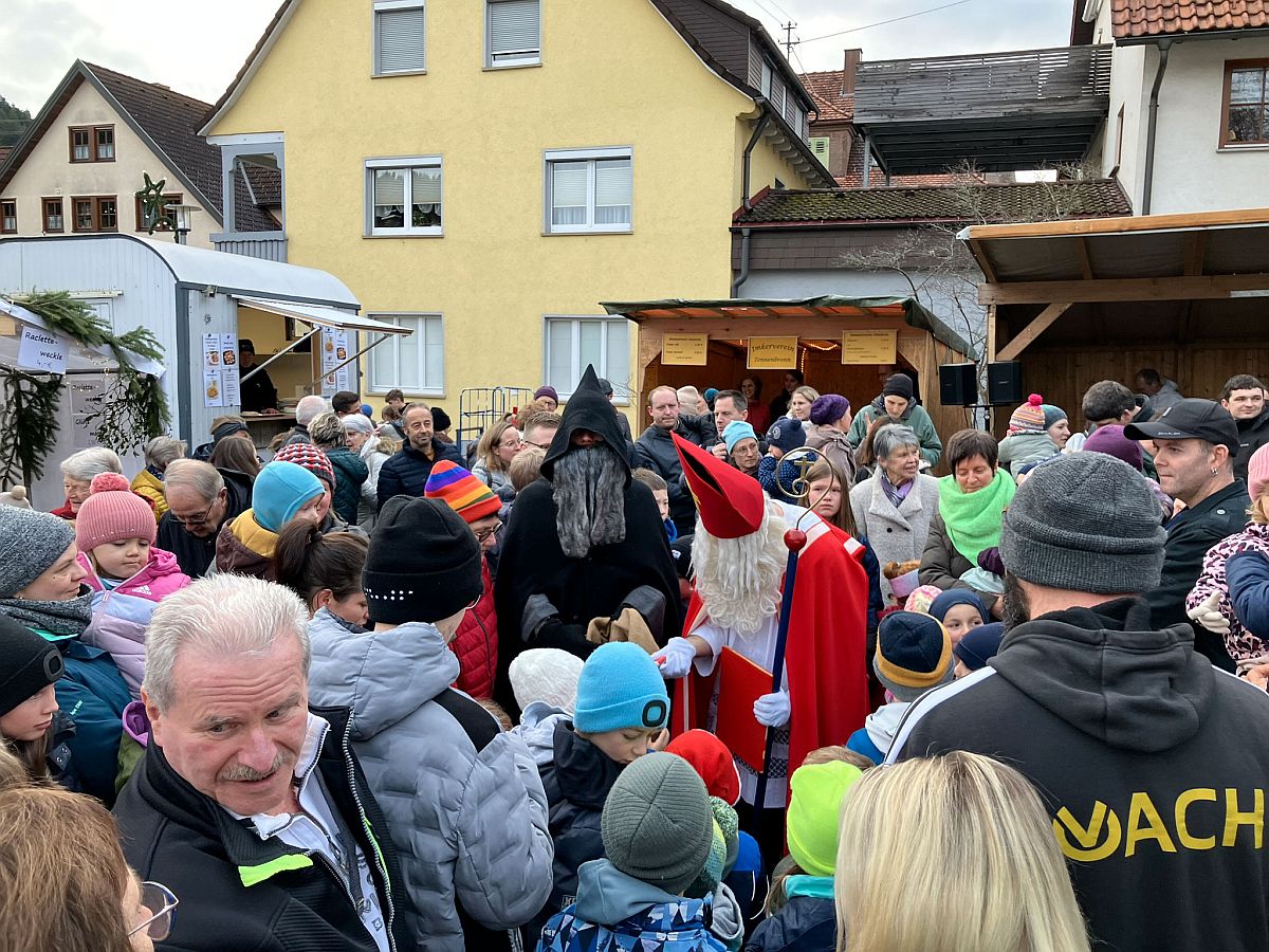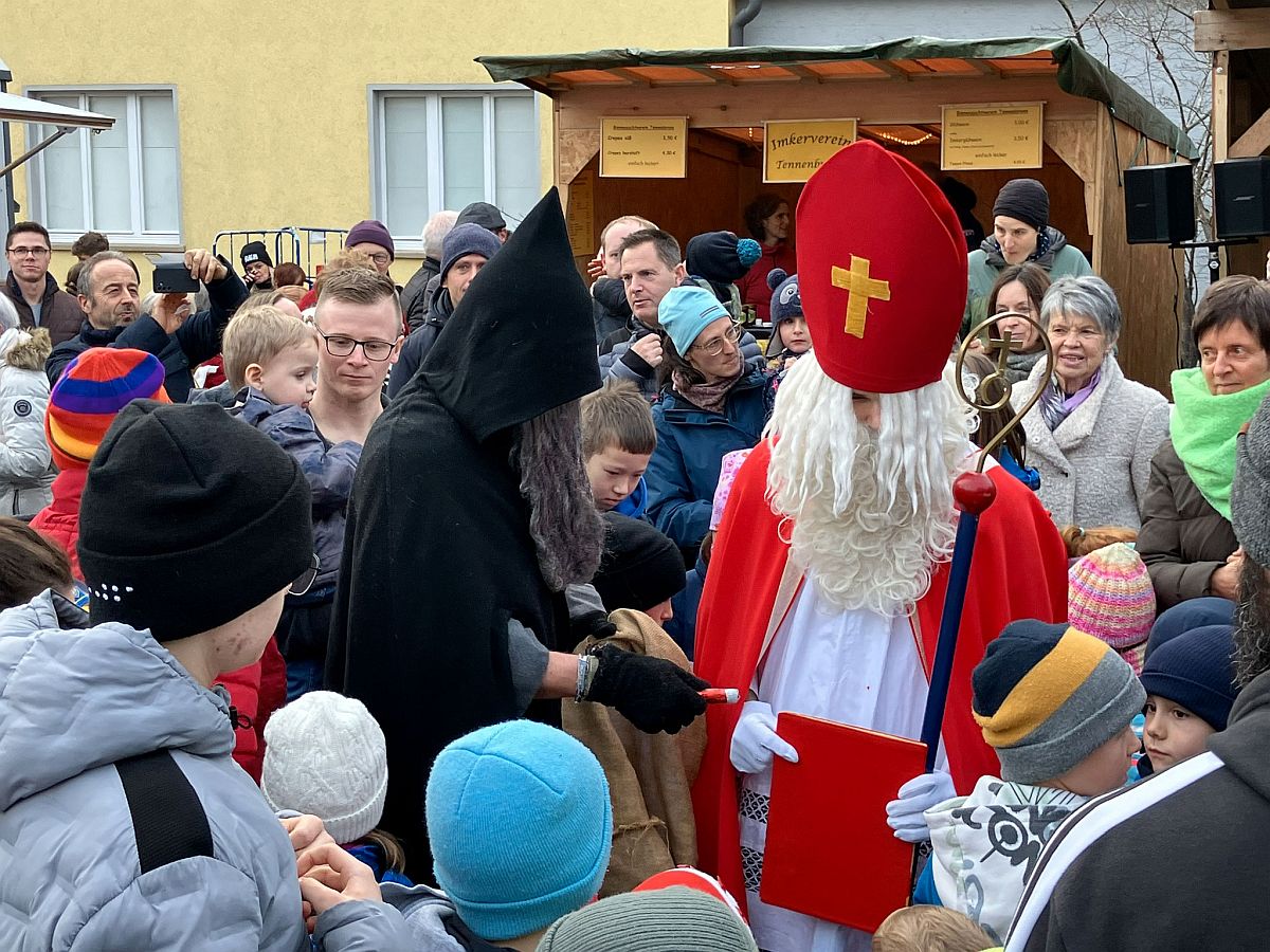 Richtig voll wird der Weihnachtsmarkt in Tennenbronn immer wenn nachmittags der Nikolaus kleine Geschenke für die Kinder bringt. Ein dichtes Gedränge herrscht dann immer auf dem Dorfplatz.